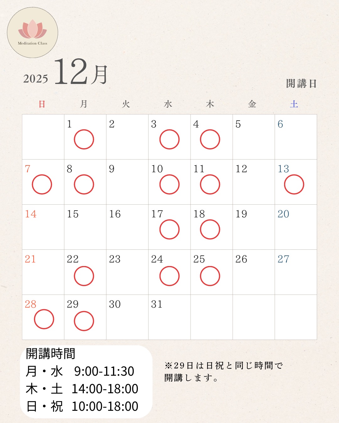 12月の開講日のご案内!!!新年に向け心と身体を整えてみませんか?記載の日程以外でも対応可能な可能性がありますので、お気軽にお問い合わせください!お問い合わせはこちらから!!!